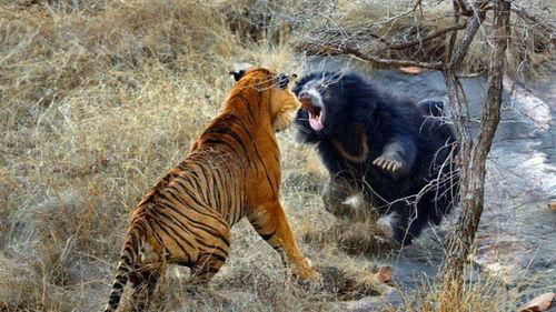 除了相遇,虎和熊之间的互动也让人津津乐道。在一段视频中,一只老虎和一只熊在争夺食物时发生了激烈的冲突。老虎凭借其敏捷的身手和强大的力量,一度占据了上风。熊并没有轻易放弃,它用厚实的身躯和顽强的毅力与老虎展开了殊死搏斗。